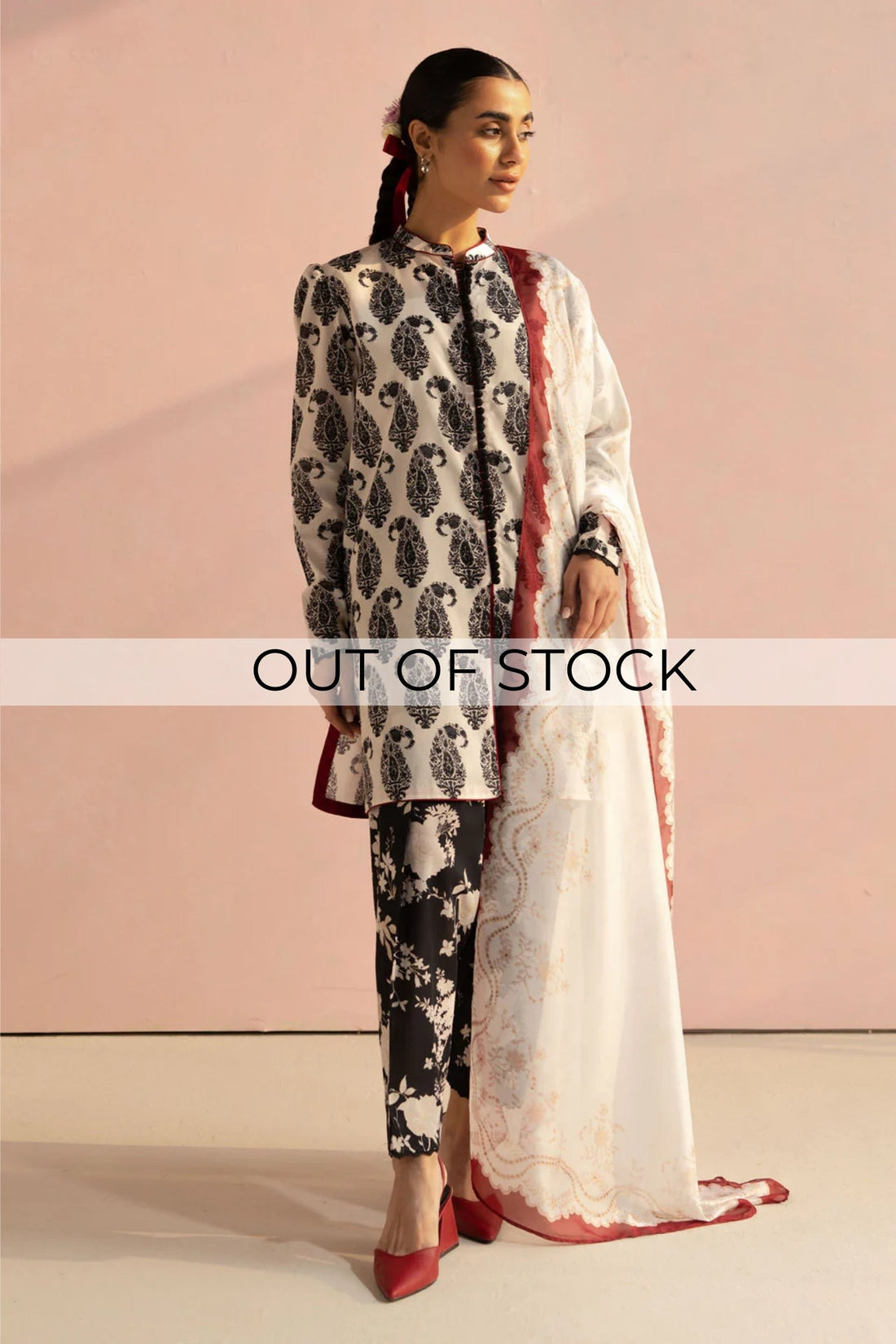 Embrace effortless elegance with this 3-piece printed lawn suit in classic black and white tones....