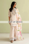 A summer white short shirt with a floral trellis paired with solid pants and styled with a watercolour-inspired lawn dupatta.