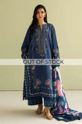 An azure long shirt with a floral trellis paired with solid pants and styled with a watercolour-inspired lawn dupatta.