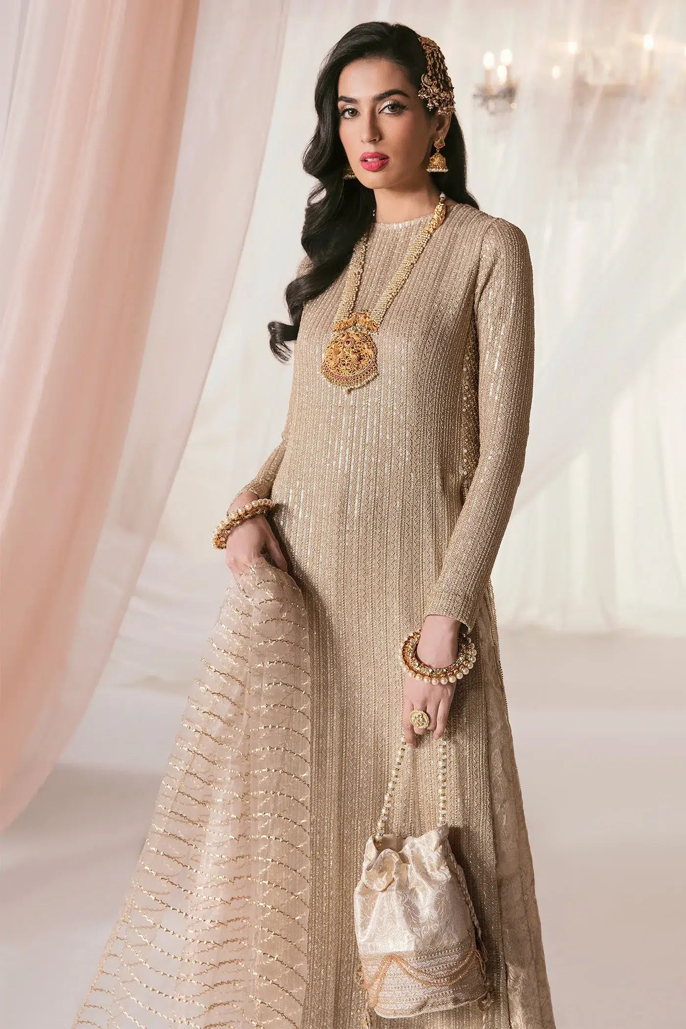 Paired with beautifully woven Kimkhaab trousers and a gracefully flowing organza dupatta, this outfit brings together traditional richness with modern flair — perfect for those unforgettable moments.