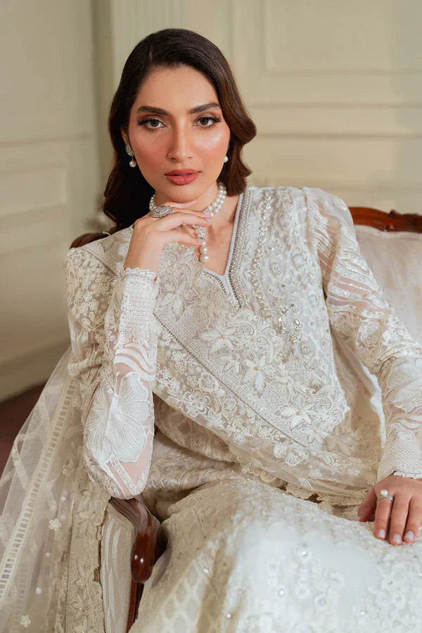 Completing the outfit is a luxurious net dupatta, delicately bordered with white-on-white embroidery. The intricate detailing throughout the dupatta enhances the overall opulence of the ensemble and adds an ethereal charm with its graceful drape.