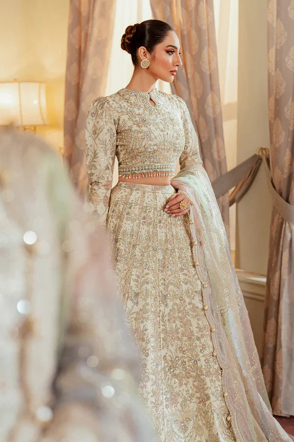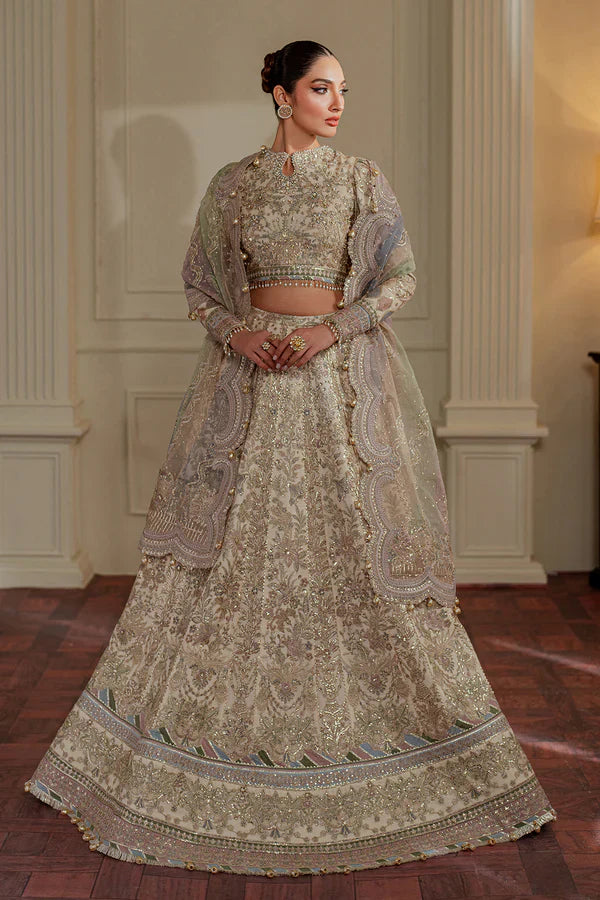 This style features a hand-embellished choli with beads at the edges and puffed sleeves that resonate with the grandeur of the outfit.