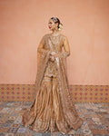 A tribute to timeless elegance, Jolina is crafted in a lustrous golden-brown hue on delicate sheer net. This outfit reflects pure sophistication with intricate resham and sequin embellishments, creating a shimmering play of tradition and modern glamour. The graceful silhouette with a flared gharara exudes drama and charm, while the embroidered net dupatta completes the look with finesse.