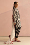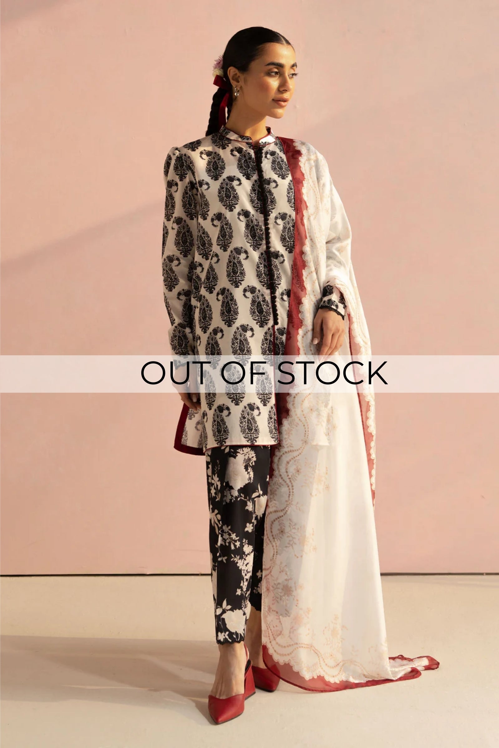 A white paisley shirt beautifully paired with a floral tapered shalwaar and styled with a lawn dupatta.