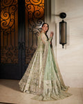 Embodying the ethos of a true FS piece, Syene is sartorial finesse at its best. Cut from dainty net in a soothing mint green hue, the pishwas showcases flourishing patterns of resham and tilla stitches arranged in a tessellated pattern. Paired with a silk churidaar and an embroidered organza dupatta, this outfit and its statuesque silhouette, will add that special charm to all your special festivities.