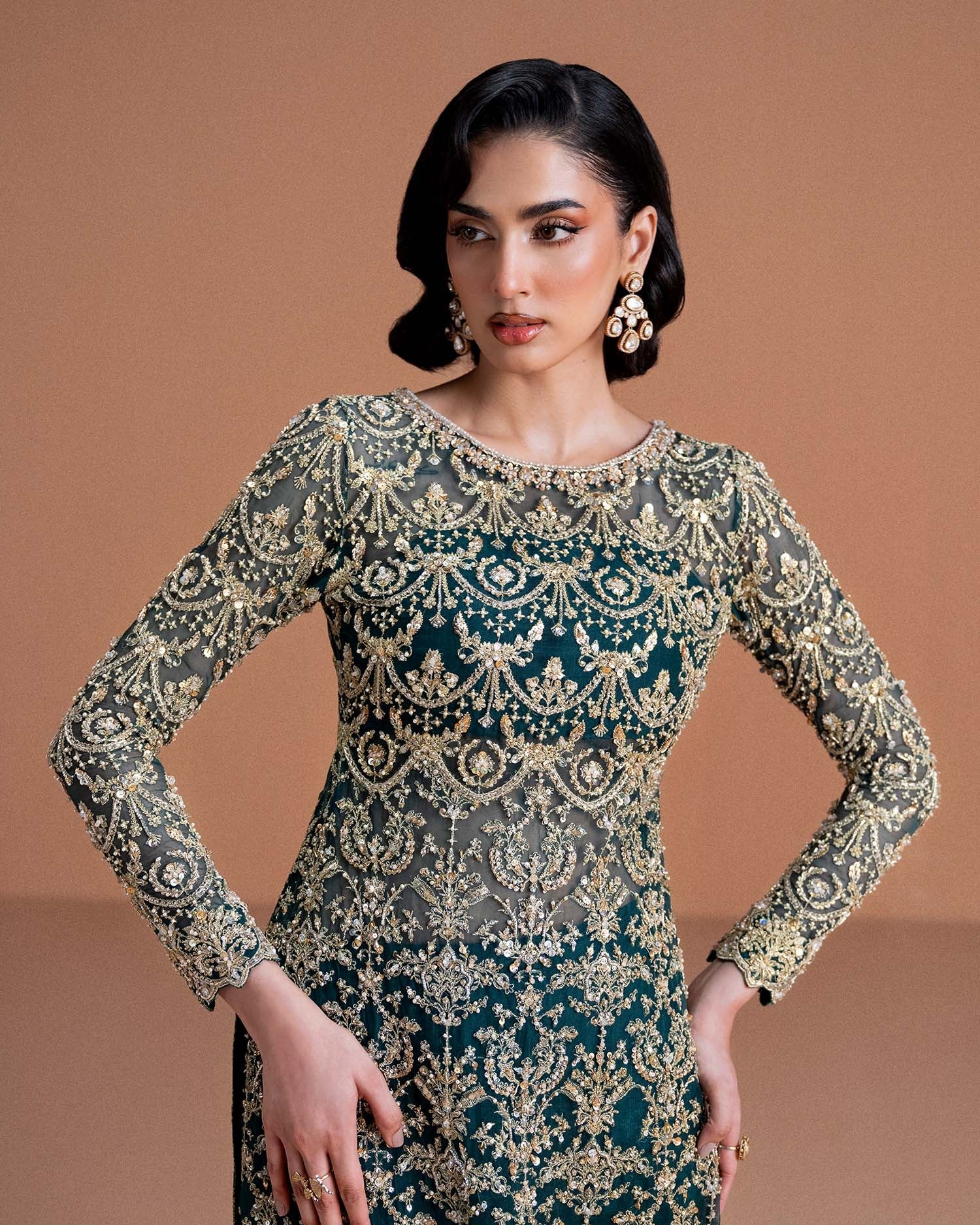 Make a rich, bold statement in this striking moss green ensemble. The long organza shirt, designed with high slits, is intricately adorned with detailed ada work, adding depth, texture, and opulence throughout. Paired with sleek straight pants to create a clean, modern silhouette, this outfit seamlessly blends timeless elegance with contemporary flair perfect for festive events and sophisticated evening affairs.